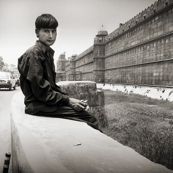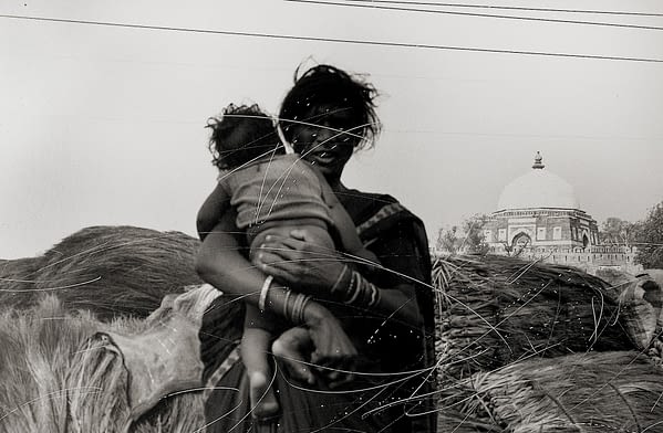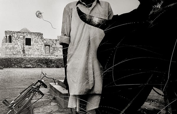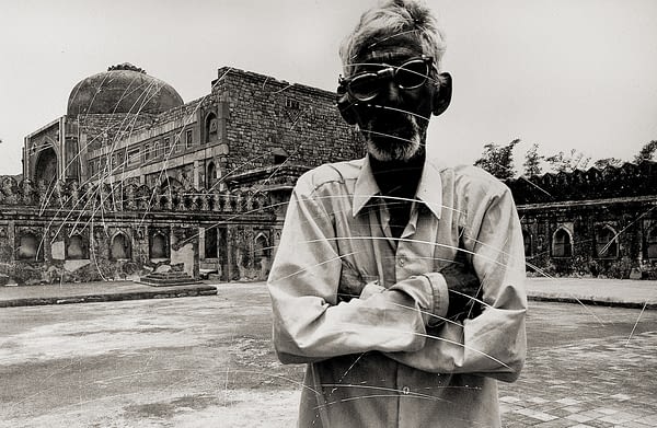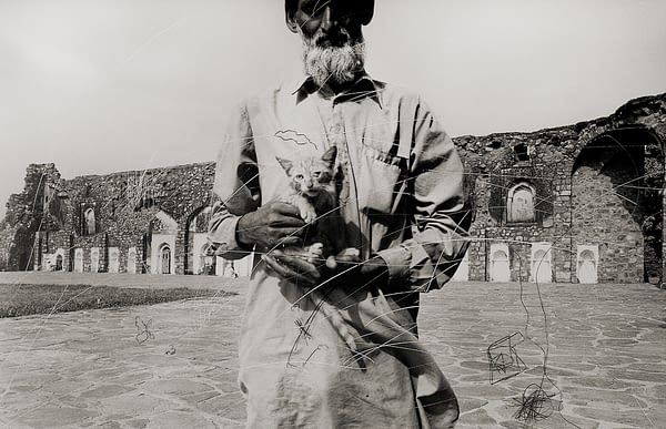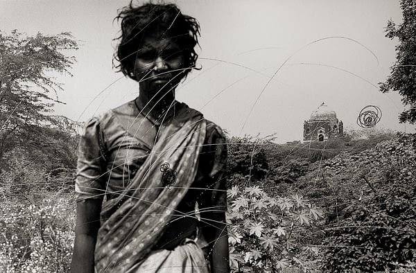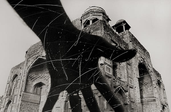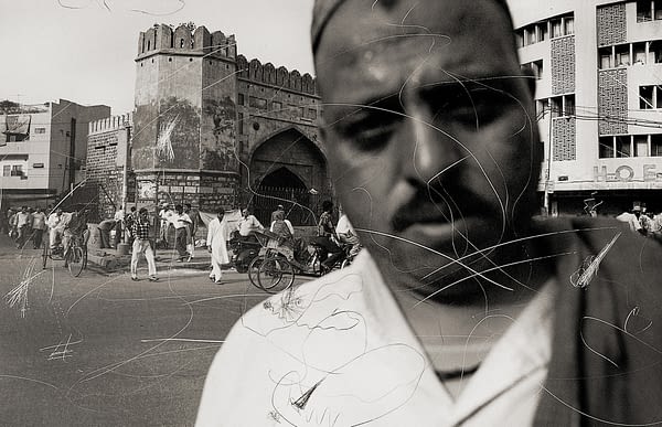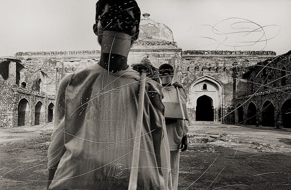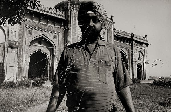 Divine Façade, is a series of scratched and doodled photographic images of the Mughal and pre-Mughal architectural monuments and built heritages in and around Delhi. While the buildings were my operational area, my focus was on the people. My interest was to unveil their relation with the heritage structure. Sometimes, persons who live nearby these locations were my models. At times, I would identify persons from different religious backgrounds from far off places and bring them to the site. In the colonial period photographs of India, architecture is the most popular theme. However, the colonial gaze always gave priority to buildings over people. The popular photographs shot by palace assigned photographers such as Felice Beato (1832 – 1909), Samuel Bourne (1834 – 1912), and John Murray (1837 – 1917), who traveled to India at the turn of the century, are classic examples. These photographs were almost completely devoid of people, creating a vision of the ‘British empire’, without referring to those who lived there. Humans, if any, were reduced to be mere scales to measure up the iconic buildings.